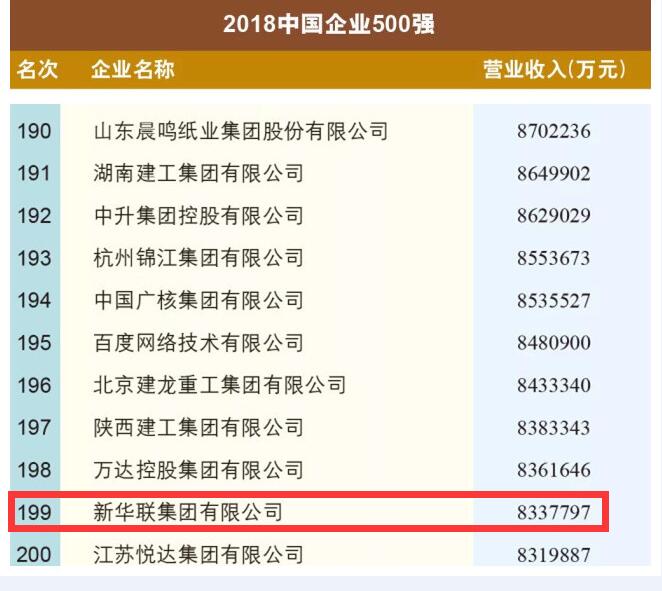 9月2日上午,中國企業聯合會、中國企業家協會在西安隆重發布2018中國企業500強排行榜。新華聯集團以年營業收入833.78億元,連續14年躋身該榜單,名列2018中國企業500強第199位,較去年上升9位。國家電網公司、中國石油化工集團公司、中國石油天然氣集團公司分別以年營業收入23580.997億元、22097.4455億元、22033.5751億元名列榜單前3位。