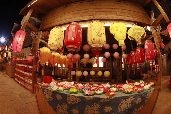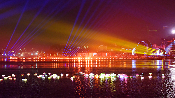 “中秋之夜”晚會以“天涯共此時”為主題,精心設置了主、副兩個舞臺。主舞臺以銅官窯古鎮水秀景觀為主體。波光粼粼的湖水、絢爛多彩的燈光、皎潔明亮的月色,恰到好處的倒影,共同營造出“水天一色,水月中秋”的詩情畫意。副舞臺設置在熱鬧的銅官美食街。街上有吹糖人、拉洋片、捏泥人等非物質文化遺產項目以及舞火龍、手工月餅、花燈等中秋節傳統民俗,還原古人過中秋的情節。銅官窯古鎮優美的意境、深厚的文化底蘊與中秋佳節花好月圓人團圓的氣氛完美融合,相得益彰。