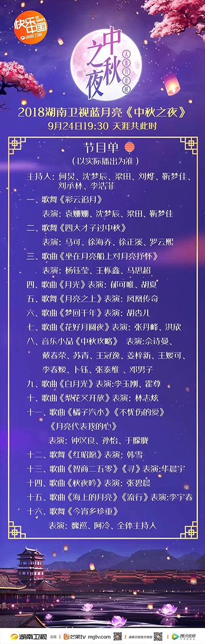 9月24日19:30,湖南衛視2018中秋晚會精彩上演。今年的晚會全程在長沙新華聯銅官窯古鎮戶外實景錄制,李宇春、華晨宇、林志炫、佘詩曼、鐘漢良、韓雪、張碧晨、袁姍姍、羅云熙等明星大咖云集銅官窯古鎮,與觀眾共度一個“星”光璀璨、亮點紛呈的“中秋之夜”。